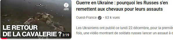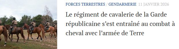 MISE A JOUR DU 14.01.2026 : Paradoxe de la guerre en Ukraine, le retour du cheval. Silencieux, endurant, rapide quand il faut, pouvant faire du tout terrain, non détectable par les radars, pouvant emporter plusieurs armes (dont un calibre 12 anti-drone), le cheval a plein de qualités dans les futures guerres de haute intensité en ambiance drones. Notre Armée dispose avec la Garde Républicaine un excellent outils pour s'adapter et définir une doctrine (vers un futur TTA150 "Combat à cheval" !!?).